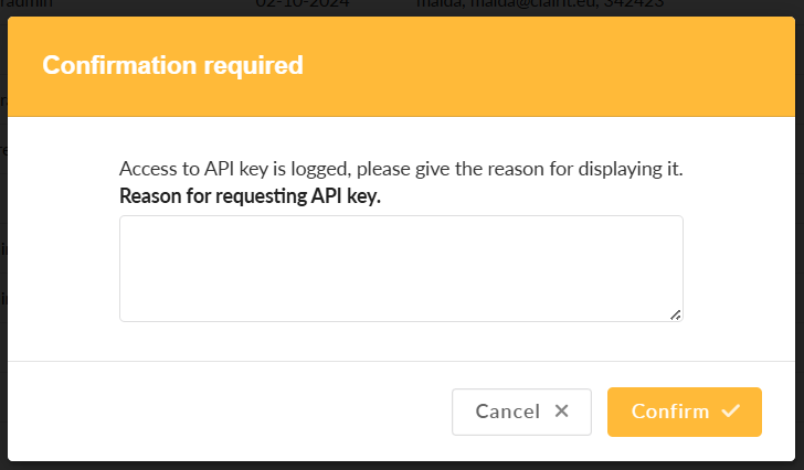 A pop-up appears asking you to enter the reason for requesting the API key. This information will be saved in the log.