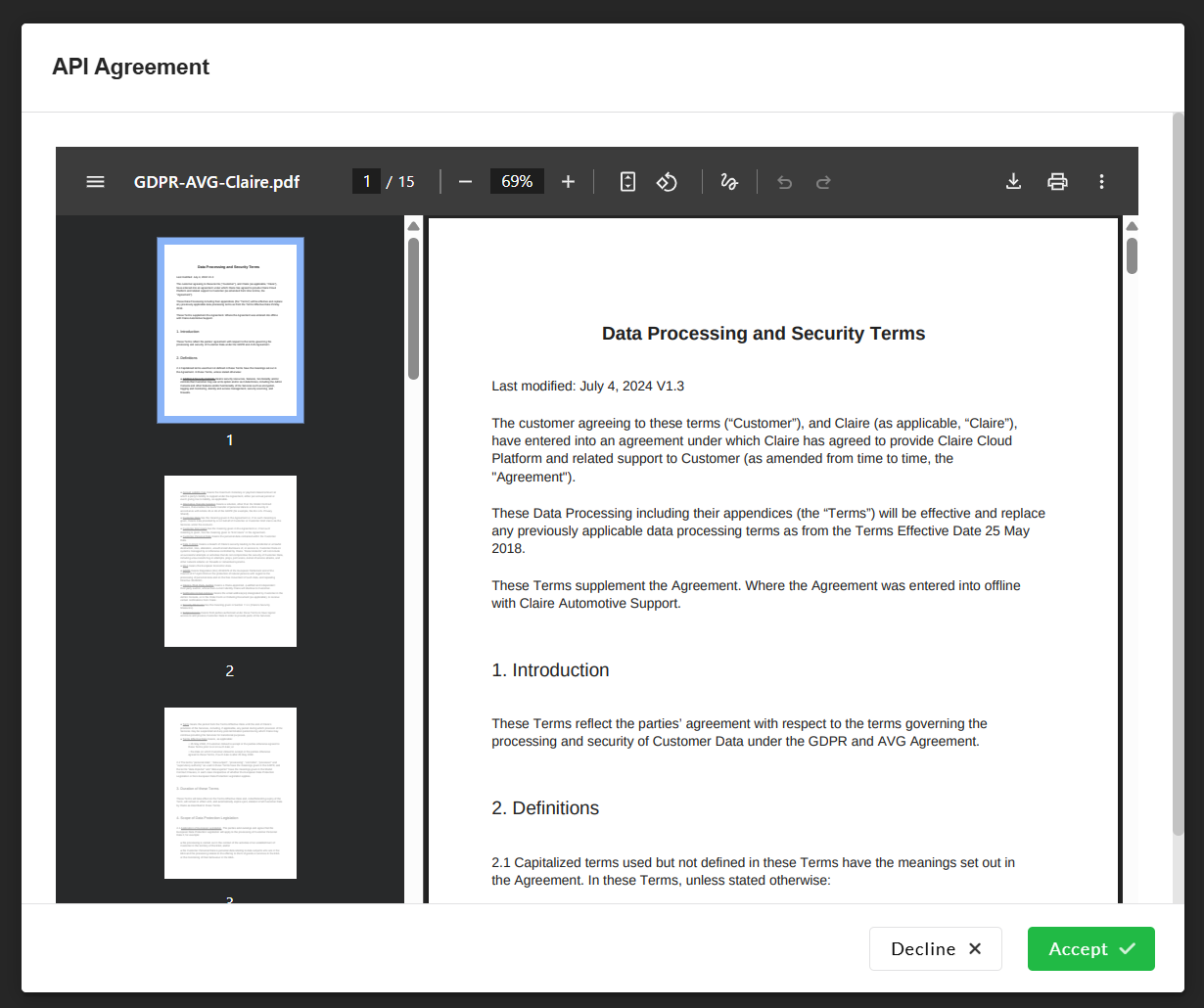 If this is the first time visiting the Claire API page, you must agree to the terms and conditions for using the API. If the agreement is not accepted, a key cannot be generated.