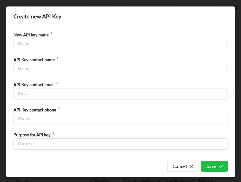 It's important that these fields are filled in with the correct information. The contact information must match the person who will actually use the API key. Should any issues, changes or other matters arise that require Claire to communicate with key holders.