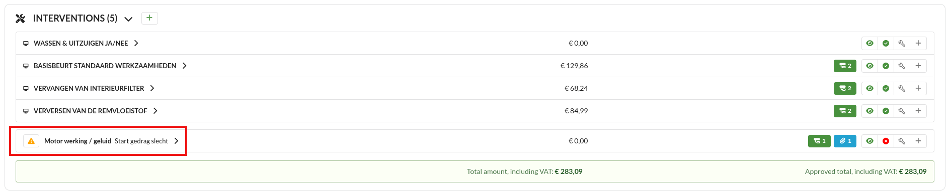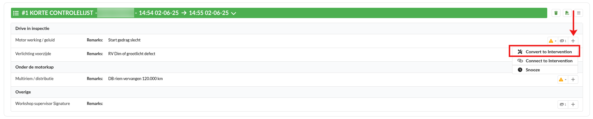Therefore, make sure the correct items are converted to an intervention!After the mechanic has performed a check, the status of the work order changes to Check Ready. The mechanic has marked items as necessary or advised, it is now the intention to communicatie this to the customer via the diagnose overview.