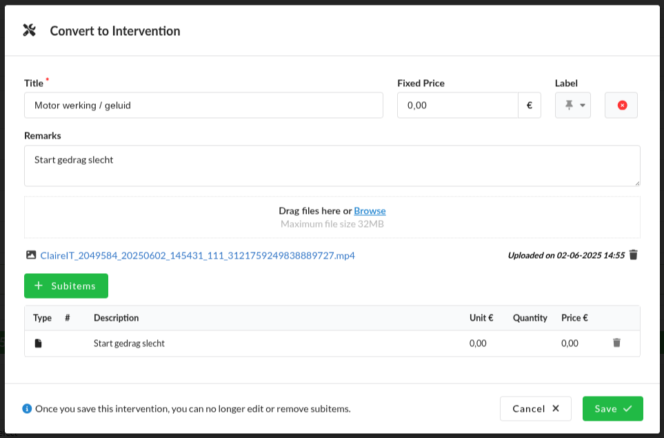 You can check whether an item has been converted to an intervention by clicking on the status icon.