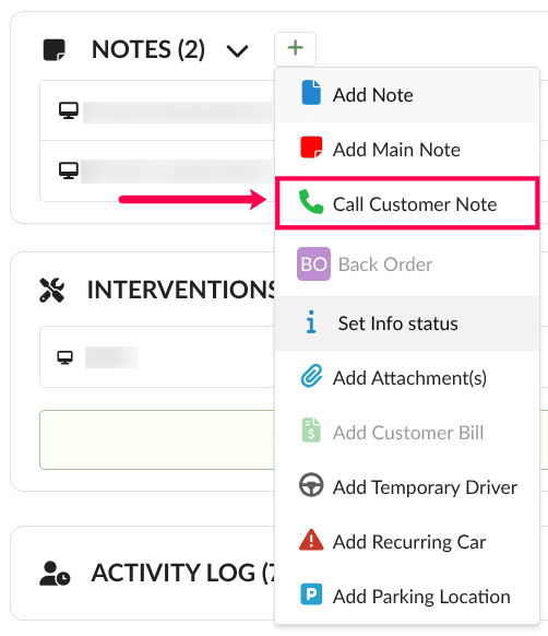 In the work order page, click on the green plus icon in the Notes box. The Customer Called note is in between.