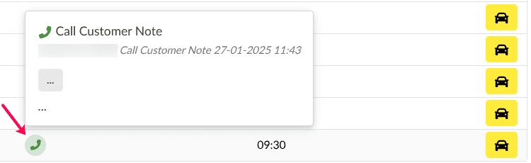 In addition, the customer called note is also visible in the appointment list. Hover over the icon to display the note.