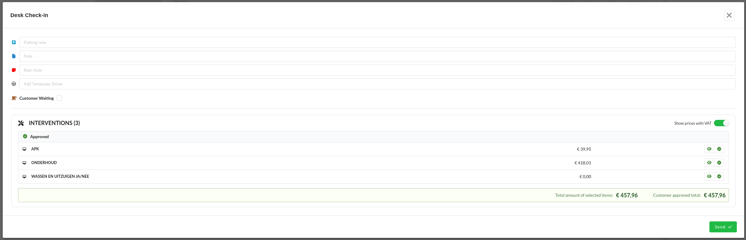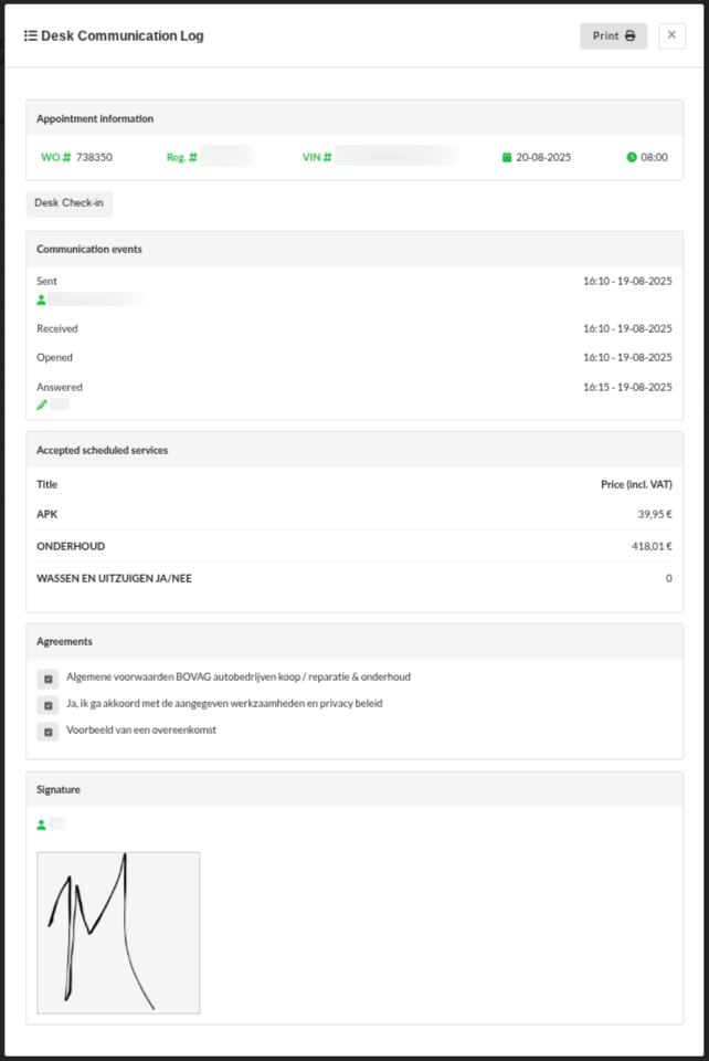 The Desk communication tool gives customers the opportunity to approve the agreed work. It accomplishes this by giving you the option to share the data about an appointment digitally to a paired tablet that was handed to your customer. Therefore improving transparency and completing your journey with Claire toward a fully paperless process.