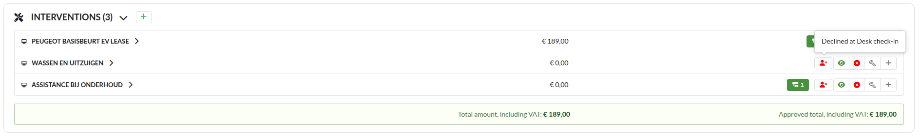 If there were any declined interventions, they will have the customer declined icon and a note with Declined at Desk check-in.