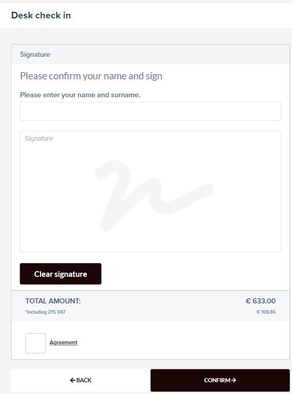 On this screen the customer must fill in his/her name, signature and accept any mandatory agreements.