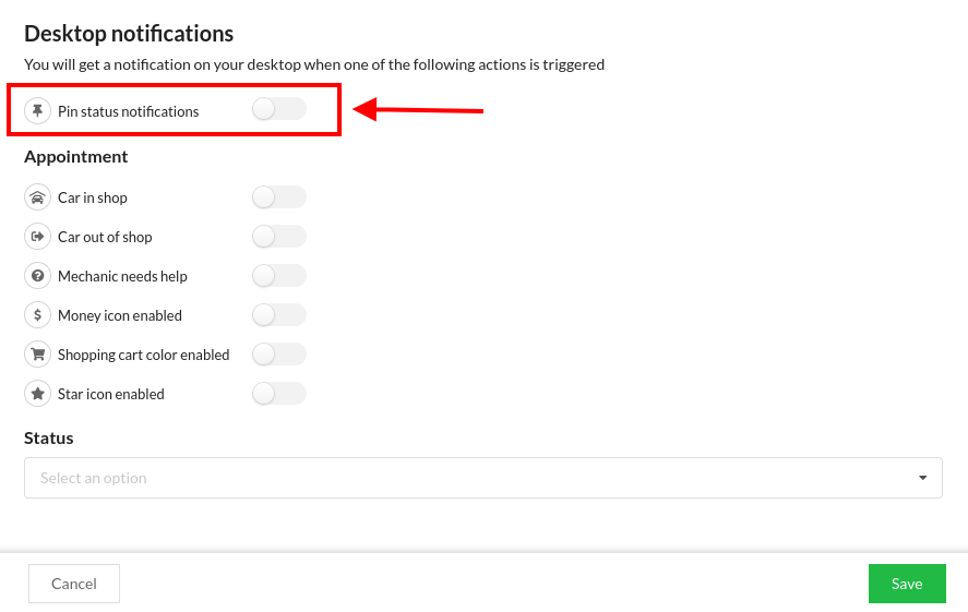 When enabled, simply go to warranty dashboard, then in the Pin status filter, select one or more statuses, you'll then receive a notification every time another user creates or updates a pin with one of your selections.