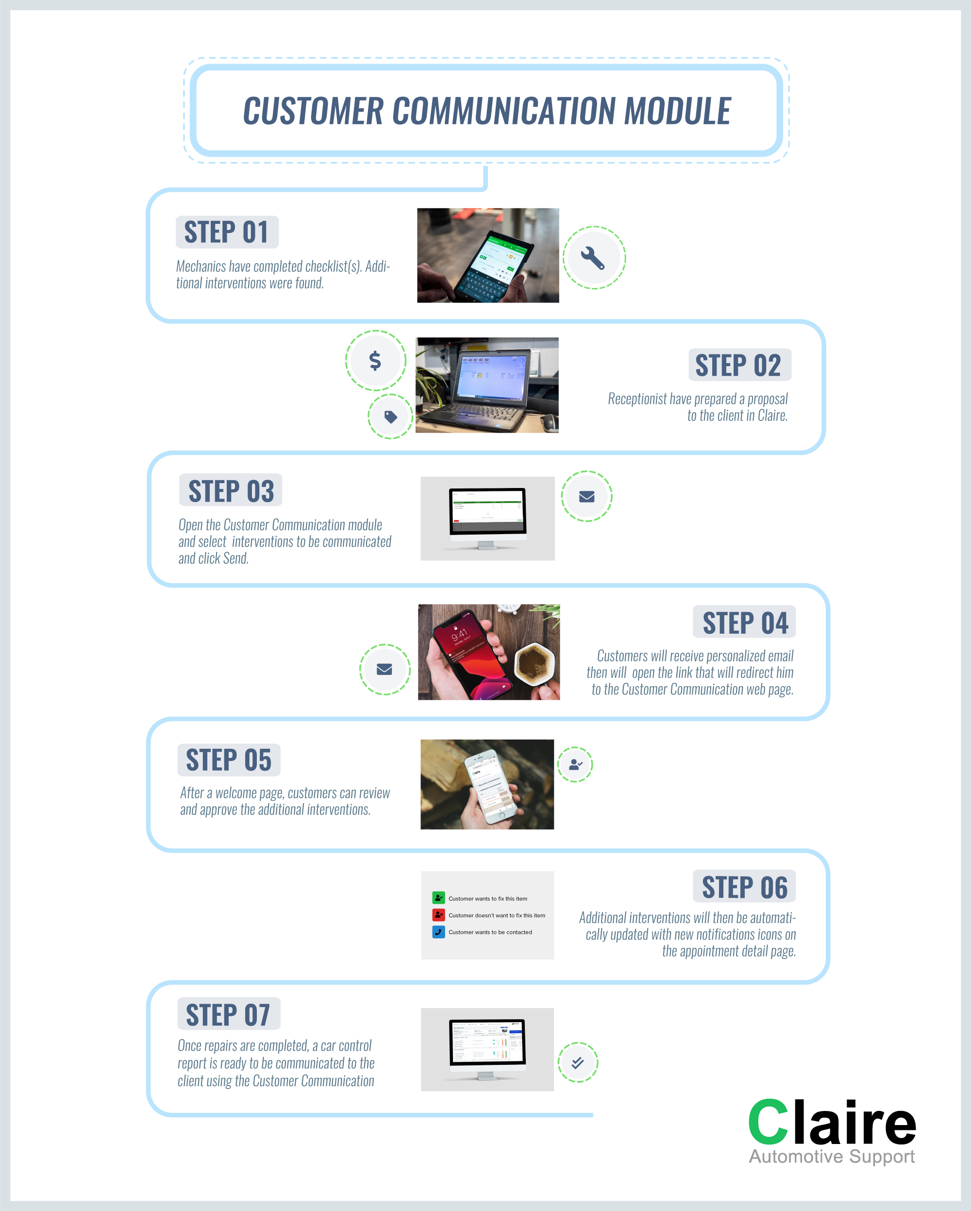 In 2019, Claire has begun to develop a module called Customer Communication module to complement the Claire process. It allows clear and transparent communication with your customer. Being a digital way of communication, it creates the unforeseen competitive advantage of allowing you to respect customers that demand social distancing. This without sacrificing the quality of information and service you are providing to them. It is built to be completely in tune with the Claire process of reducing delays and frictions at your workplace.