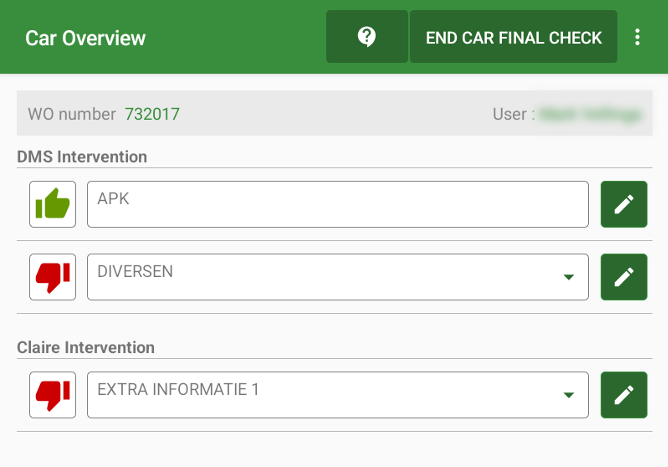 The Car Final Check you indicate which interventions, from your DMS and Claire, are fixed/repaired. Here you can also add any necessary remarks, pictures and/or videos for each of them. It is also through this that you mark the car as ready.