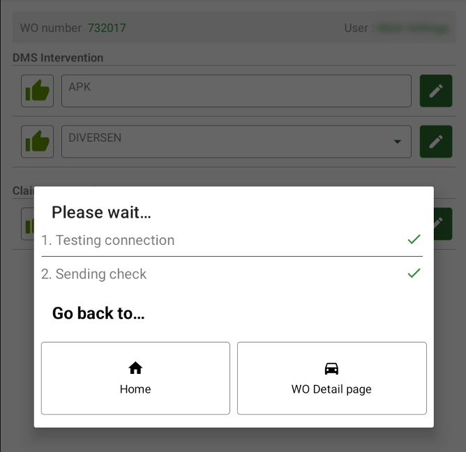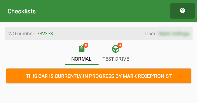 In case a mechanic is doing a check on a workorder and another mechanic tries to start a different checklist on the same workorder, he/she sees a message in orange: 'This car is currently in pregress by XXX'. The mechanic is allowed to start a Test Drive or any other checklist that does not update the status.