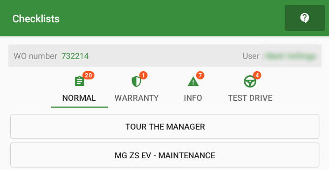 The clipboard button gives you access to the different checklist categories: Normal, Warranty, Info and Test Drive. Each category is available depending on the status of the workorder. These are explained here below.