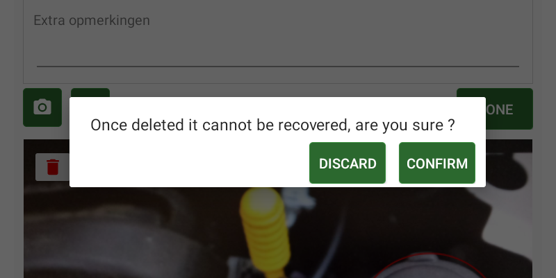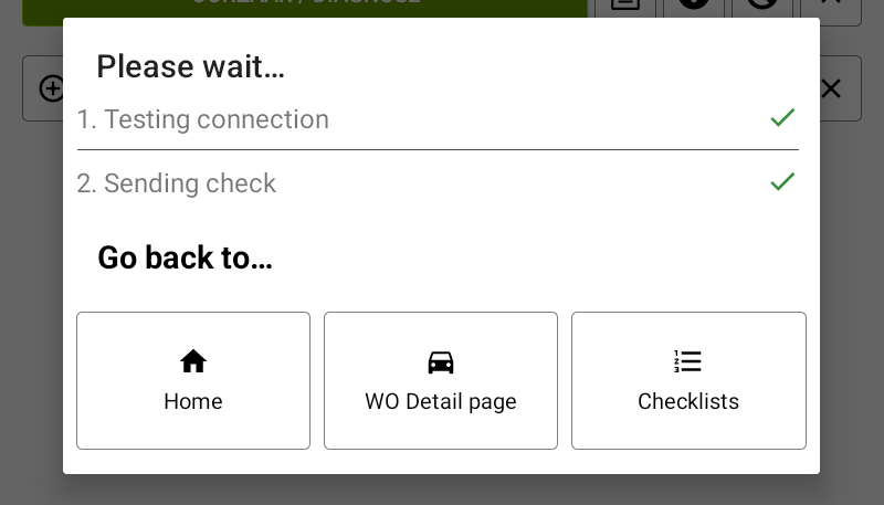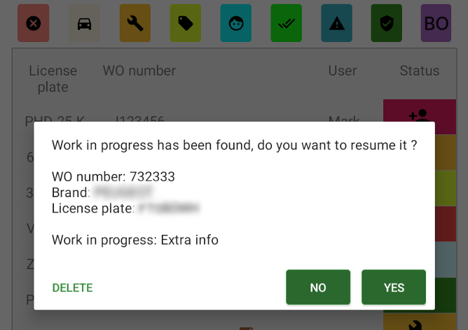 In case the mechanics tablet crashes during an inspection, he/she gets a pop-up to resume work in progress when the app is restarted. This gives the following three options: