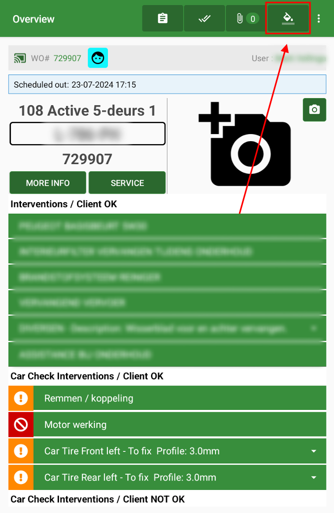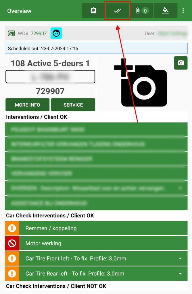 The mechanic can report his work finished in the meantime by clicking on the icon with the two check marks in the top right corner of the screen. The status will not change to 'car ready' until all work has been completed. By reporting the car ready, you communicate directly with the reception about the progress of the work.