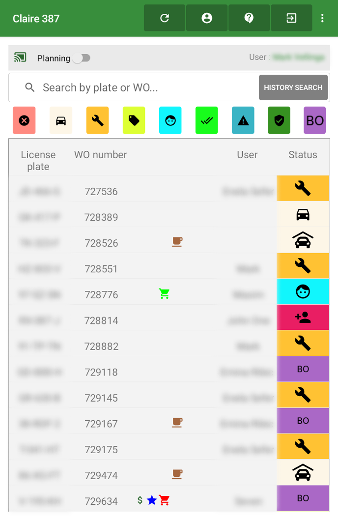 You can search for registration number or WO number at the top, but you can also directly open your WO by clicking on it.