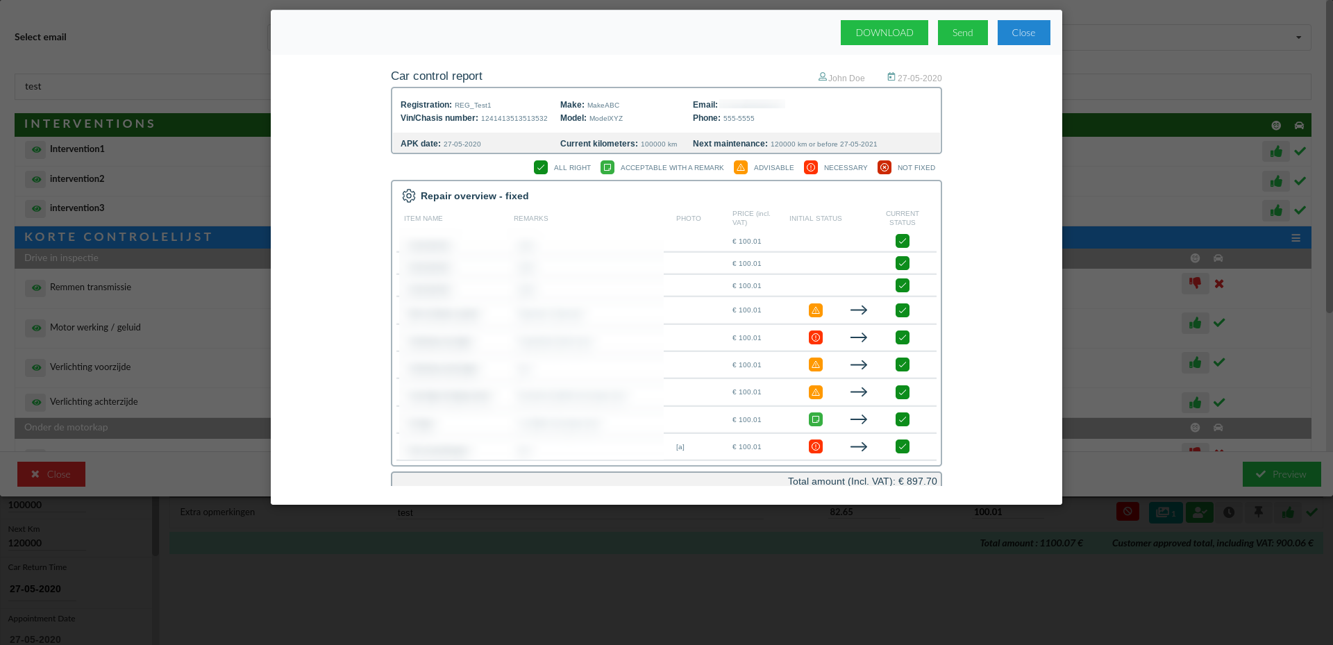 A page will appear showing a preview of Repair Overview. On it, you can Download the report and/or Send it to the customer by clicking one of the green buttons on the top right corner.