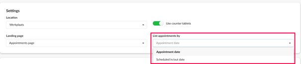 Navigate to the settings header and click on the dropdown menu under List appointments by. Change this to Scheduled in/out date.