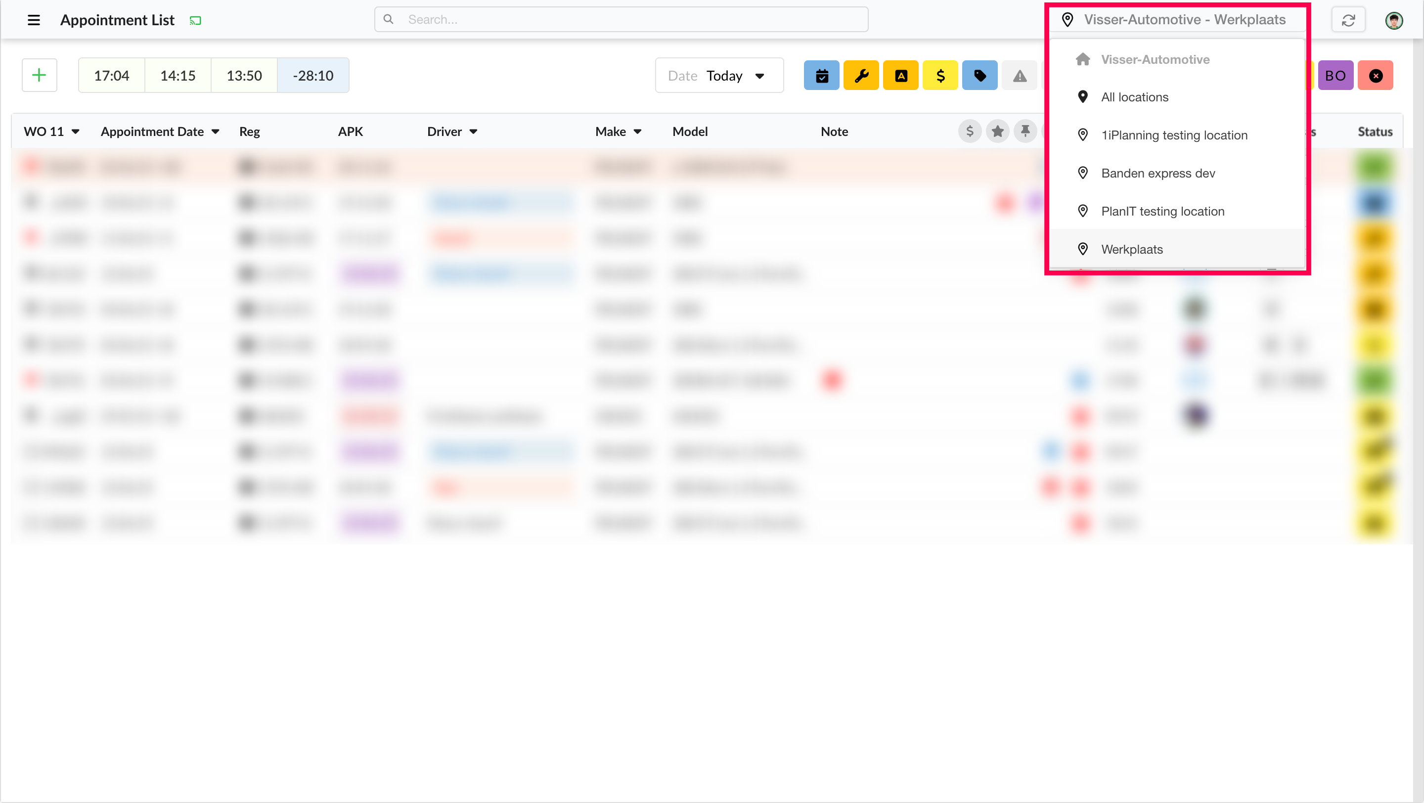 that all locations are visible.Enable Location column visible to see an extra column in the appointmentlist, here you can see the location of the WO when all locations are selected.