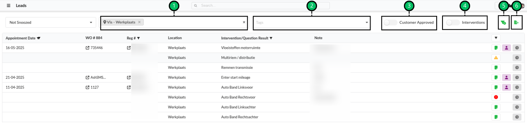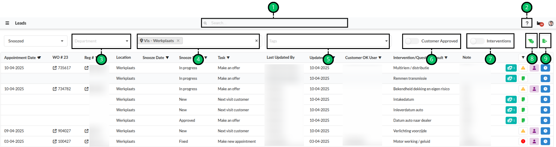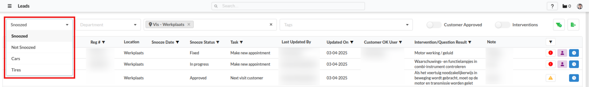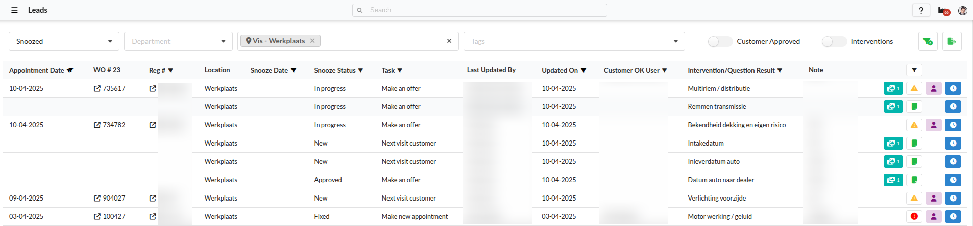 Reg# | The registration number of the snoozed item. If nothing is entered here, this snoozed item belongs to the workorder above it. This column can be filtered by lease or no lease.* |