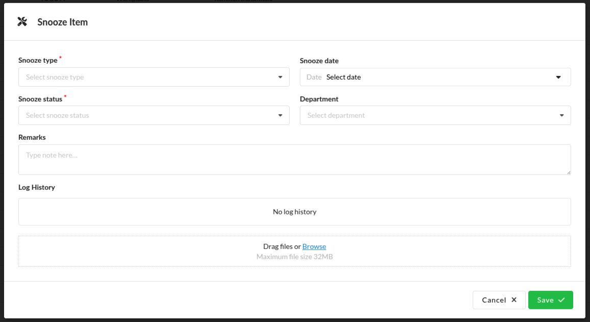 Snooze Status | Filter by the entered snooze status of snoozed items, such as: new, pending, approved, etc. |