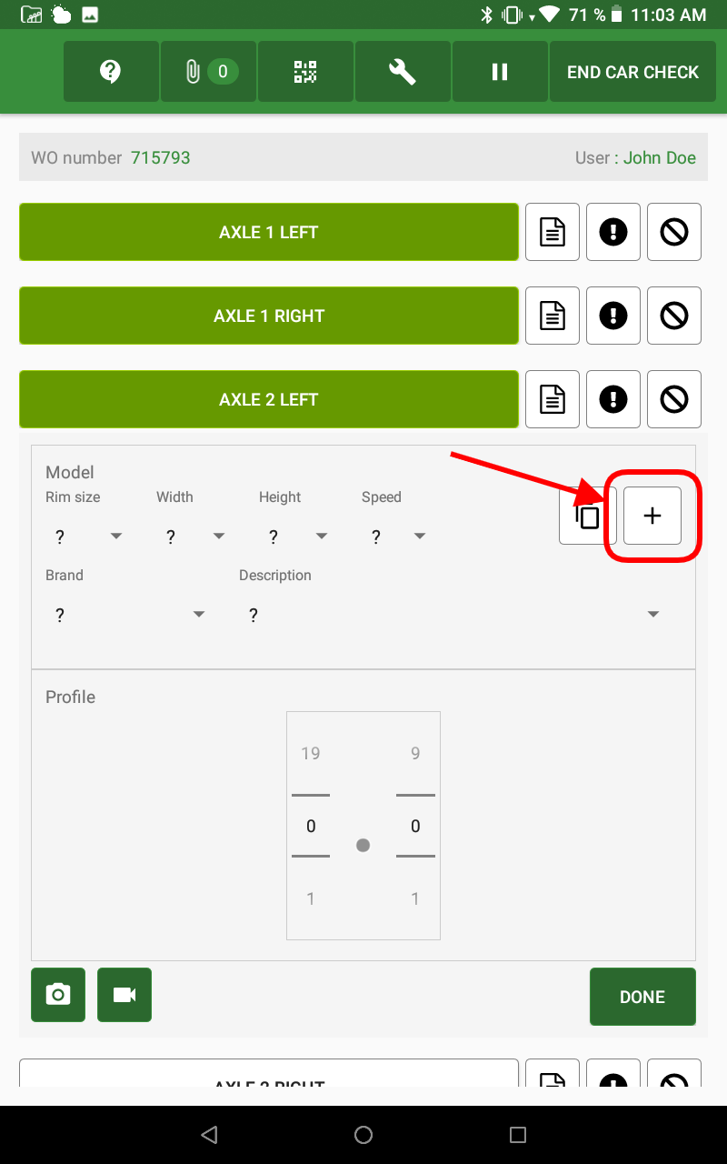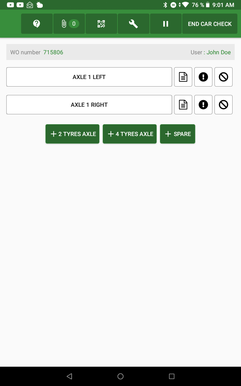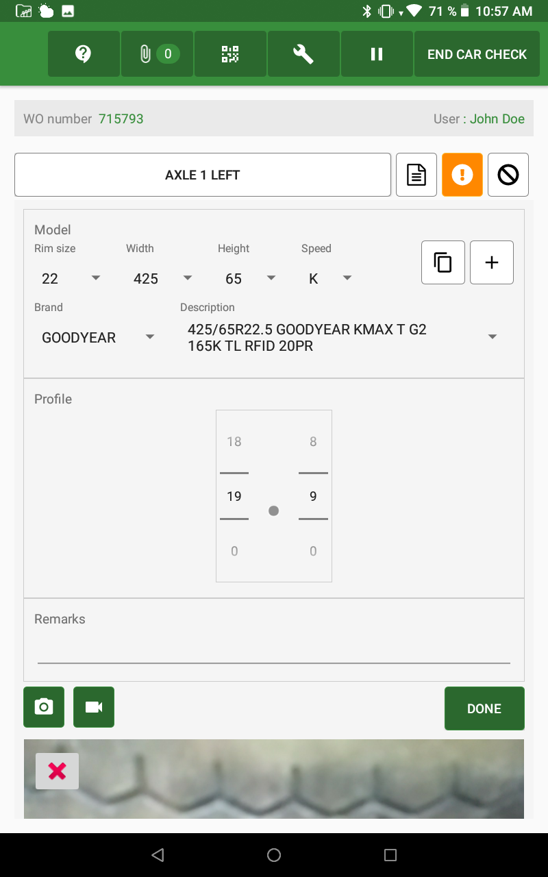 Similar to other standard questions, the tires truck question must be included in a checklist/control for mechanics to perform it on their tablet. It retains the most of the behaviour as standard elements (e.g.: Status must be selected and pictures or videos can be added).