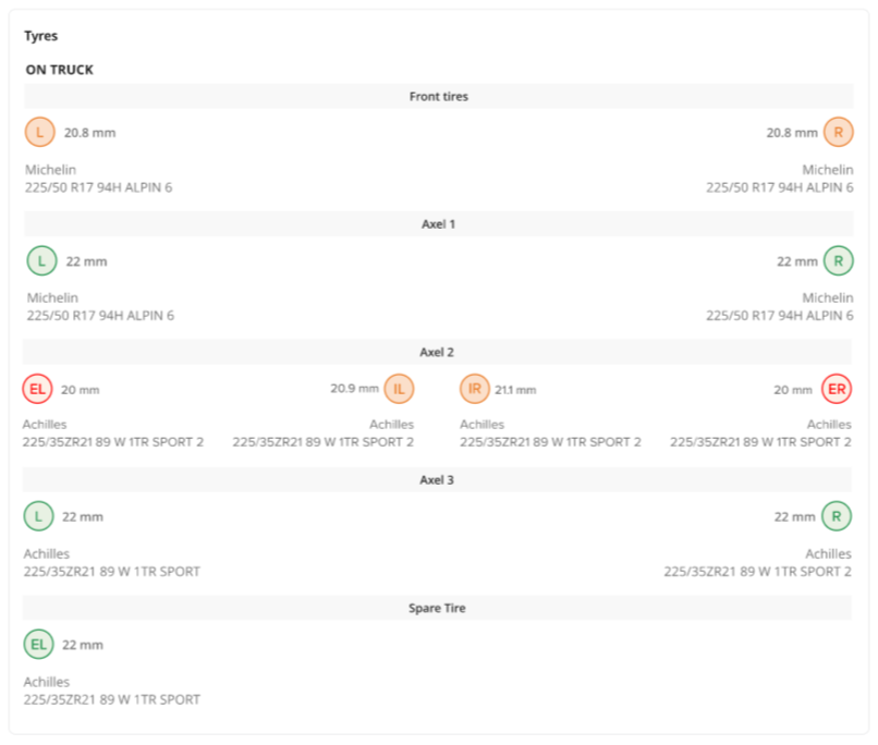 On the vehicle details page, you will be able to review the most recent update regarding the tires.