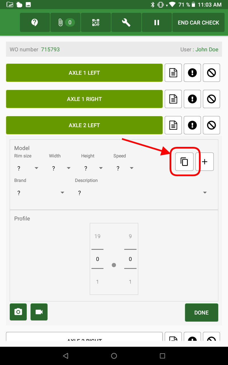 Note that by completing any LEFT tires, the RIGHT tires will be automatically be pre-filled with the same value. Moreover after selecting FRONT tires value you will be able to copy its value to the REAR tires using the button indicated below: