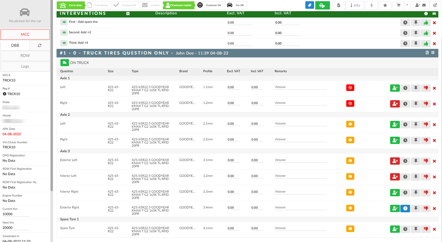 If a tire position is marked as Customer OK it will be listed under Claire interventions in the Car Overview screen.