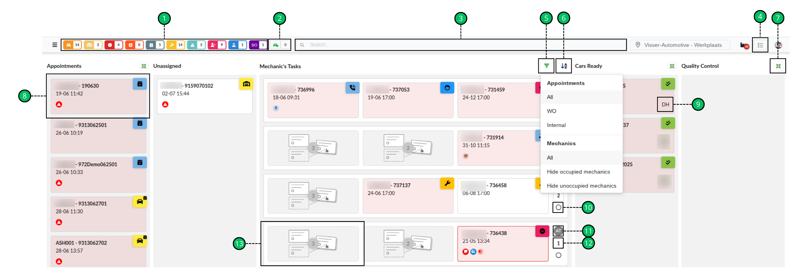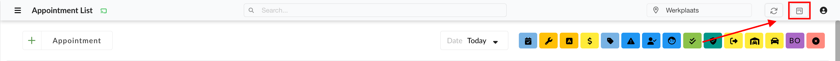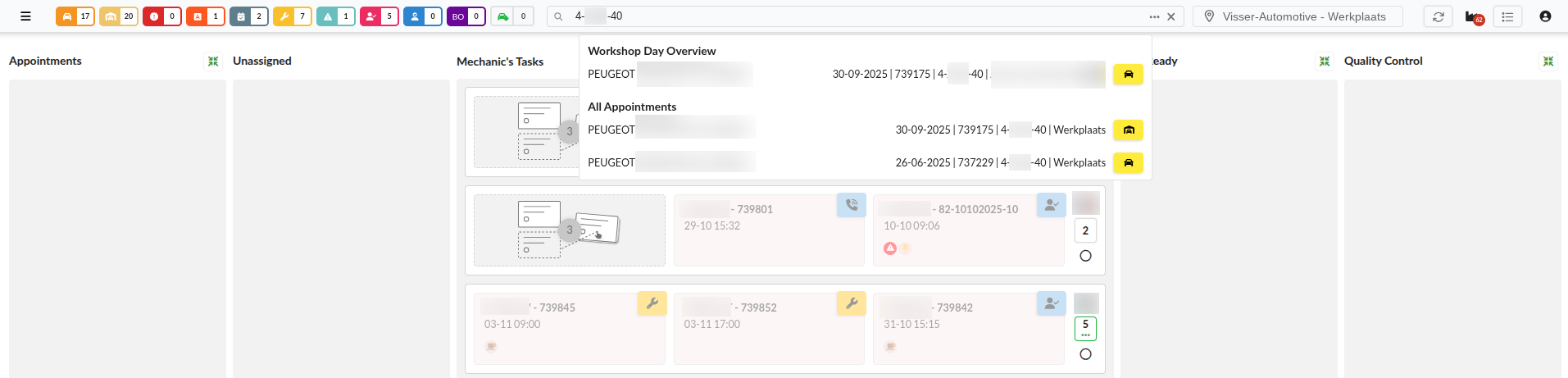 The search function works as following: It is possible to search on workorder number, license plate and customer name. Click on the three dots to show all the results. The results are divided in two sections: Workshop Day Overview and All Appointments.