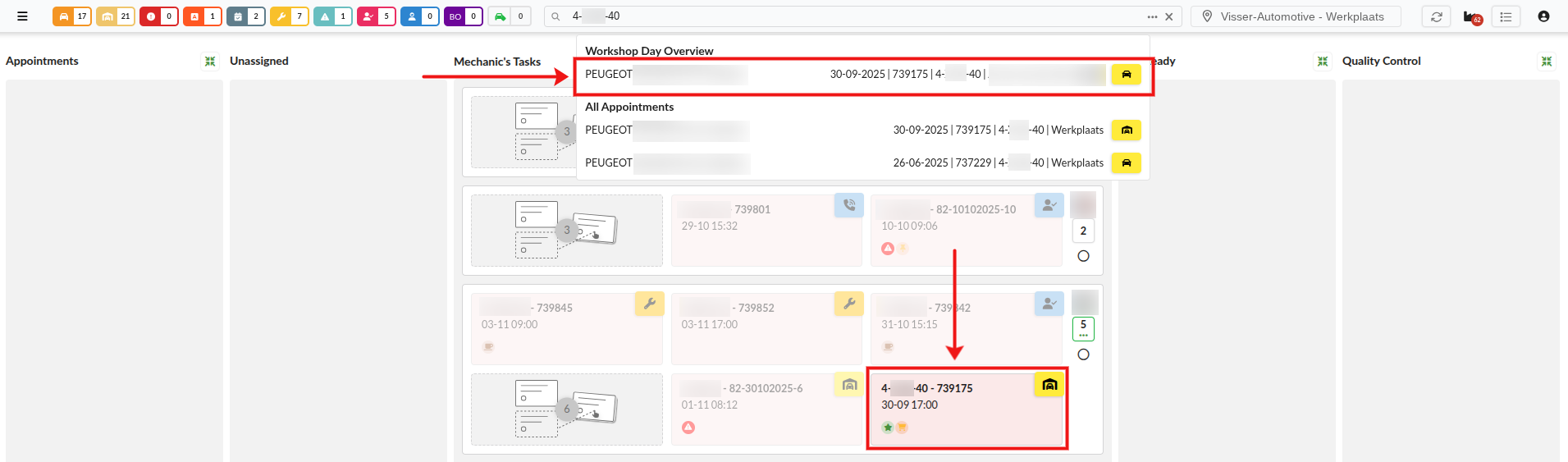 By clicking on the result under Workshop Day Overview, it automatically searches for the workorder in the overview, for instance if it is assigned to a mechanic: