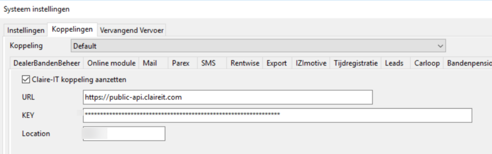 Location: Vraag Claire support voor location id per locatie of zoek de juiste ID in de API sleutel pagina