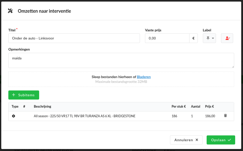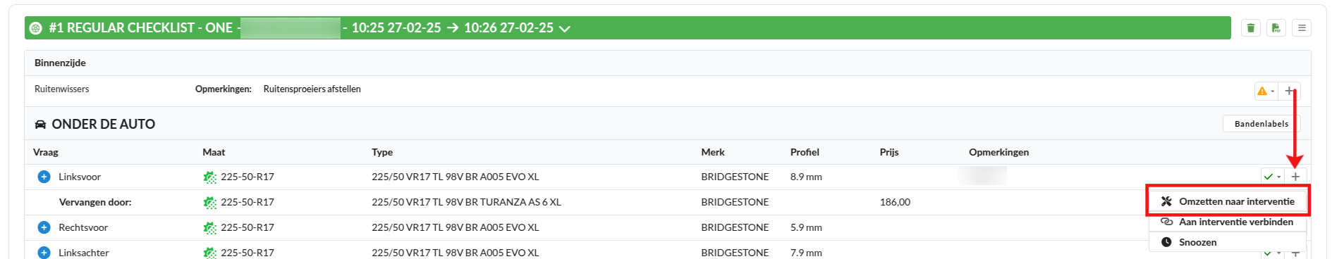 Nieuw in Claire is het omzetten naar interventie, zodat de vervangende band aan de klant kan worden aangeboden. Doe dit door te klikken op het grijze plusje achter de band en Omzetten naar interventie te kiezen.
