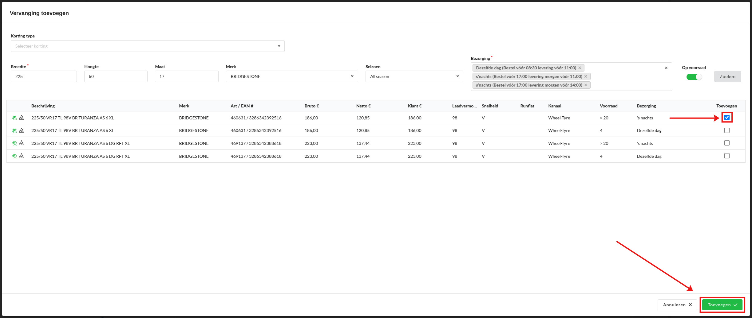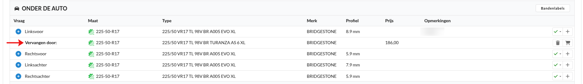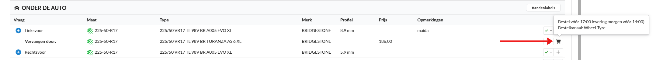 Nadat de klant akkoord is gegaan met de vervanging, kun je de band bestellen. Klik op het grijze winkelwagentje achter de vervangende band.