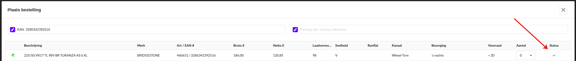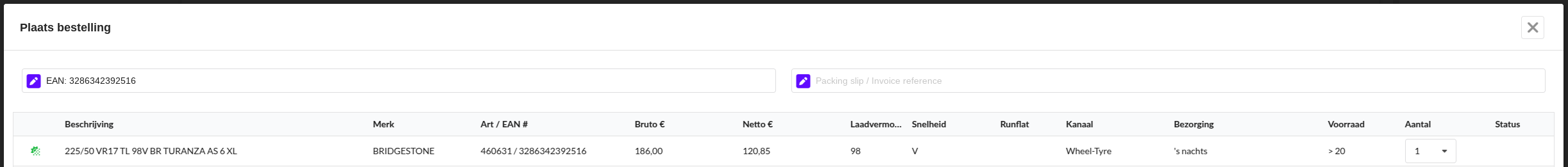 Het is hier mogelijk om tekst in te voeren in het veld Pakbon / Factuurreferentie, deze is vervolgens zichtbaar zijn op het kanaalportaal in de sectie Referentie voor de geplaatste bestelling(en). Het veld links wordt vooraf gevuld met de EAN van de eerste band.