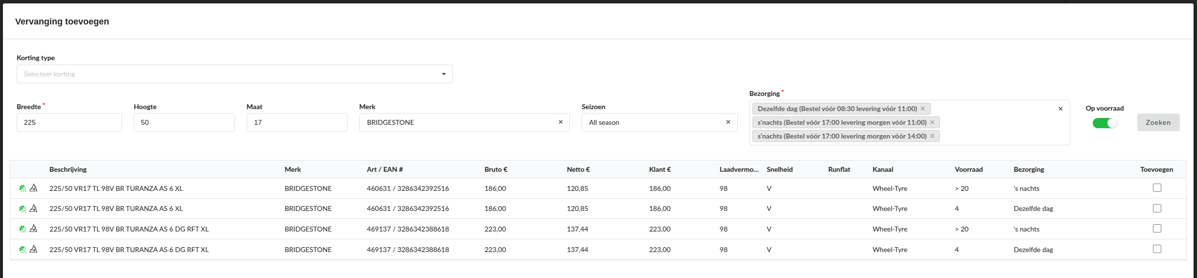 Hierdoor zien receptionisten in Claire wat die aanbieders op voorraad hebben (inclusief prijzen) en kunnen ze, indien er een bandencheck is gedaan, direct een bestelling plaatsen op de afspraak detail pagina.