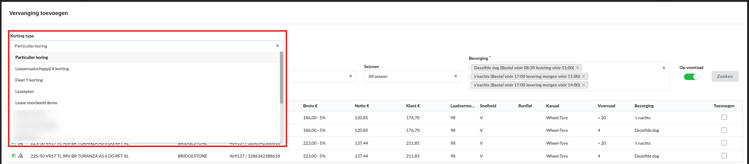 Het is mogelijk om korting of extra marge aan een band toe te voegen in Claire. Momenteel is dit alleen gebouwd in V7, klik hier voor meer informatie. Je kunt deze korting selecteren in het scherm Vervanging toevoegen door op de dropdown onder Kortingstype te klikken.