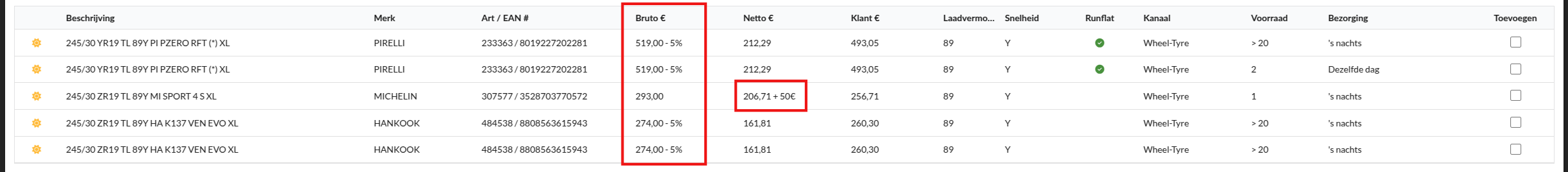Afhankelijk van de geselecteerde optie is de hoeveelheid korting/marge gereflecteerd in de bruto of netto prijs van de band.