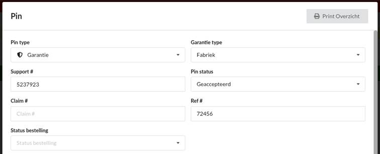 pin type Garantie en status niet ingesteld om