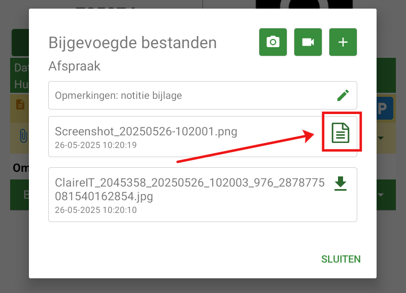 Notitie: wanneer een bijlage is toegevoegd kun je deze niet meer verwijderen vanaf de tablet. Om deze te verwijderen moet je dit vragen aan een gebruiker met een desktop account.