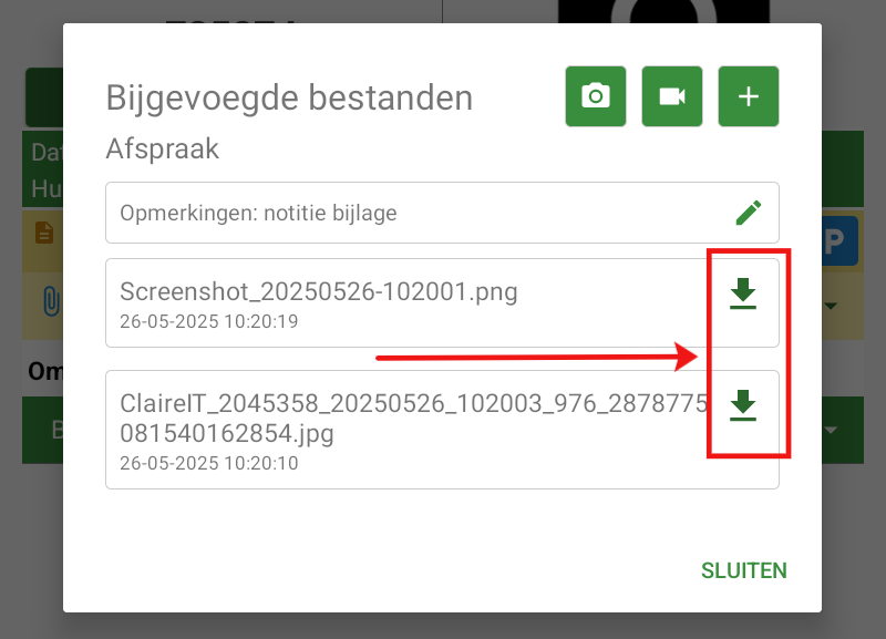 Nadat je op het paperclip icoon hebt geklikt, verschijnt een modaal. Klik hier op het pijl icoon om een bestand te downloaden.
