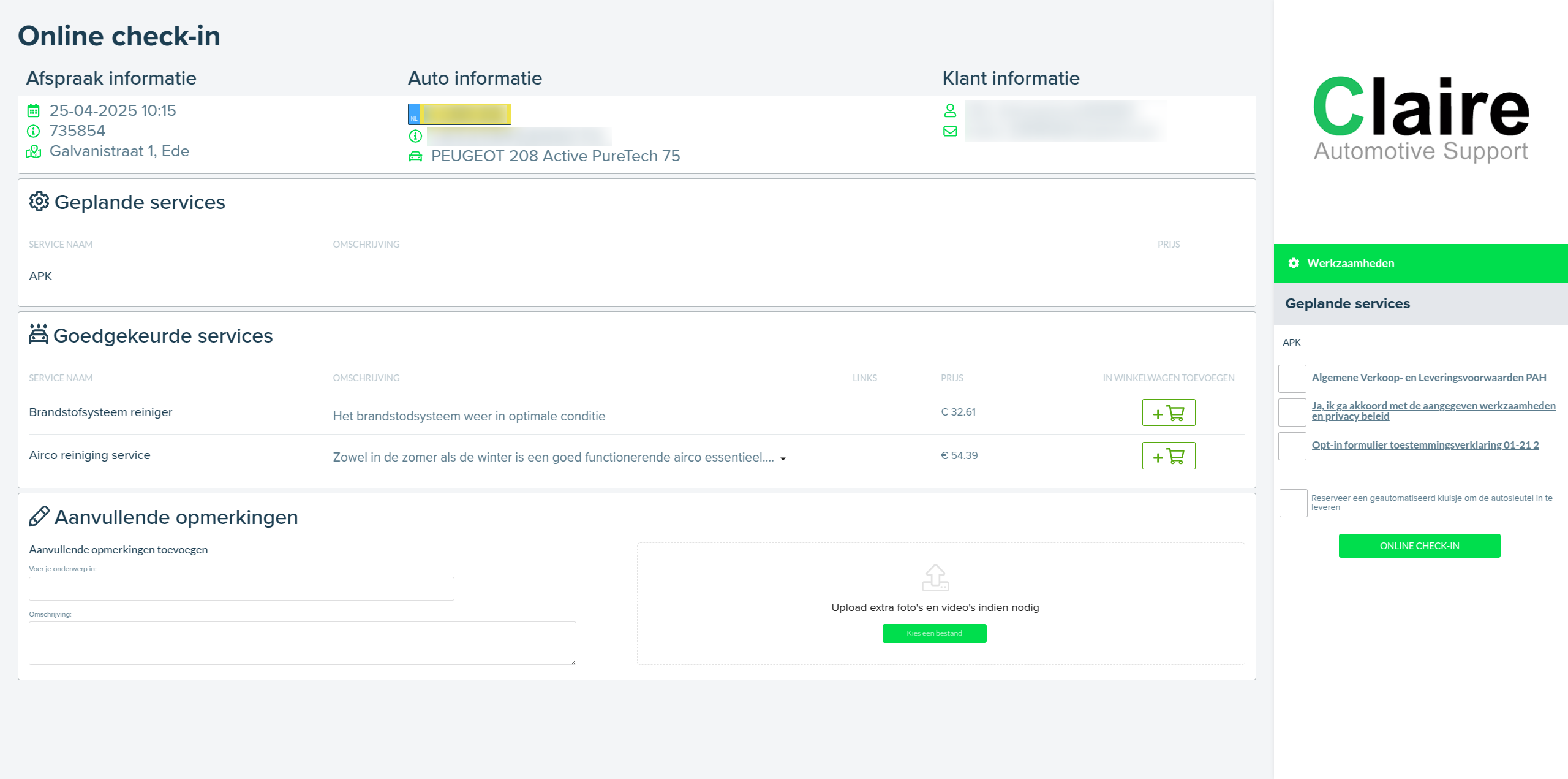 A few days before the appointment, the customer automatically receives an email with a link to the online check-in. This email can be styled to match your company’s branding and contains all the information about the appointment, including an overview of the scheduled work. Through the online check-in, the customer can easily select additional services and add comments. Accepted services and comments are automatically forwarded to Claire as action points for the front desk, ensuring the workshop visit is as well prepared as possible.