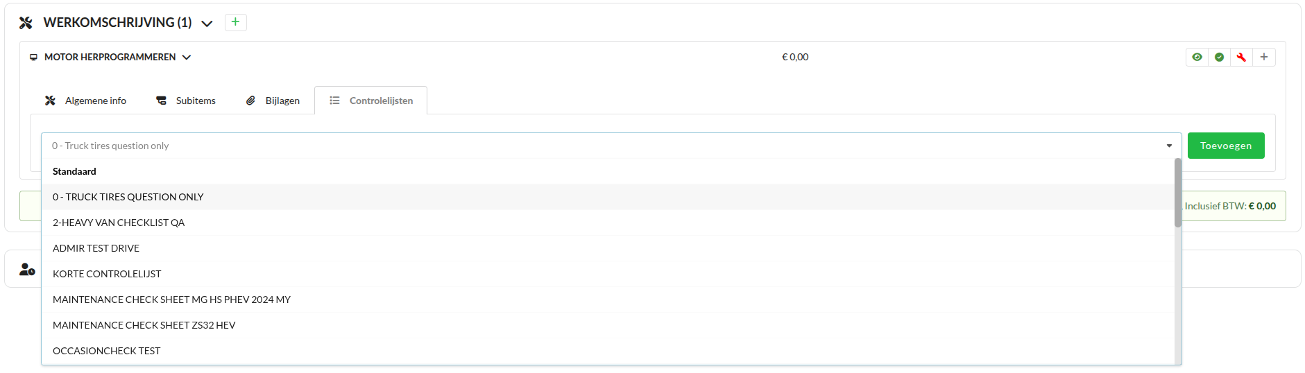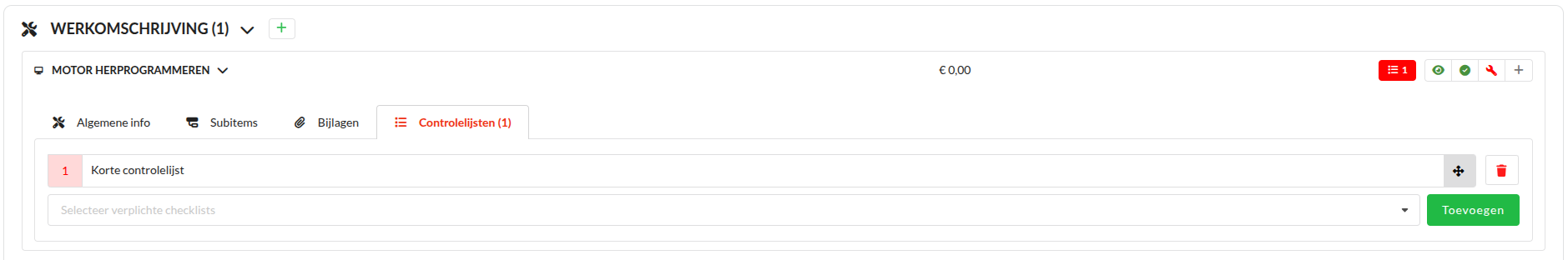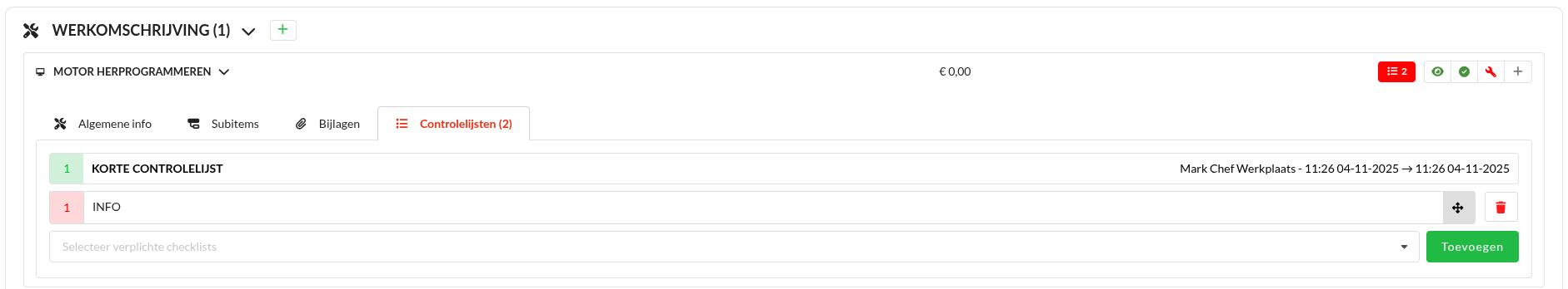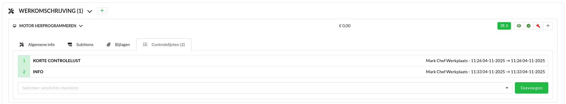 Selecteer een controlelijst en klik op Toevoegen. Het is nu verplicht om deze controlelijst uit te voeren in de werkorder. Het is daarnaast mogelijk om meerdere controlelijsten toe te voegen aan een interventie.