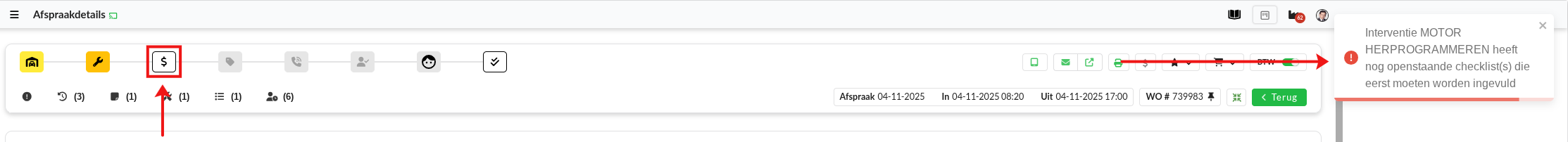 Wanneer een controlelijst is toegewezen zie je een rood cijfer en rood controlelijst icoon op de interventie verschijnen. Dit betekend dat de controlelijst nog niet is uitgevoerd.