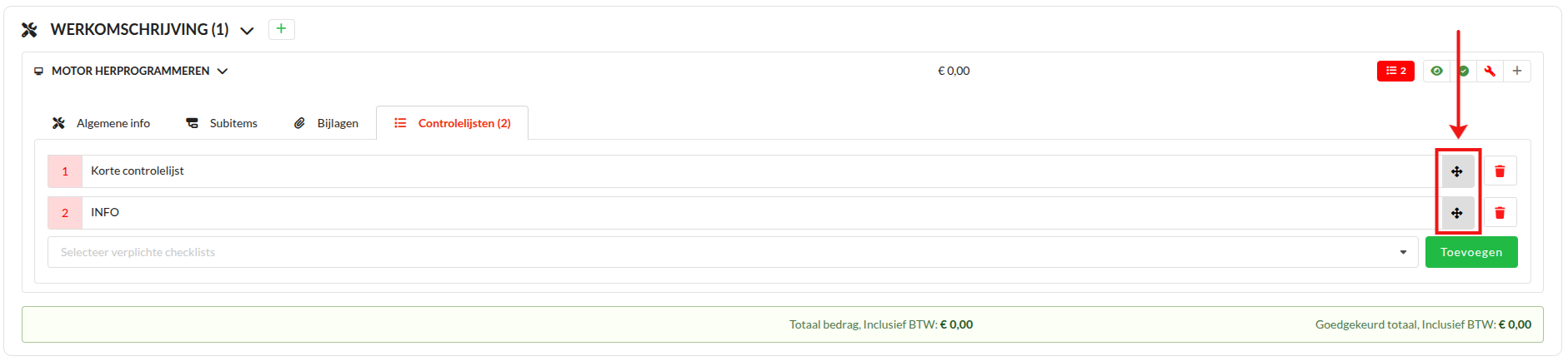 Als er meerdere controlelijst zijn toegevoegd, dan kun je de volgorde met behulp van het grijze pijl icoon wijzigen.