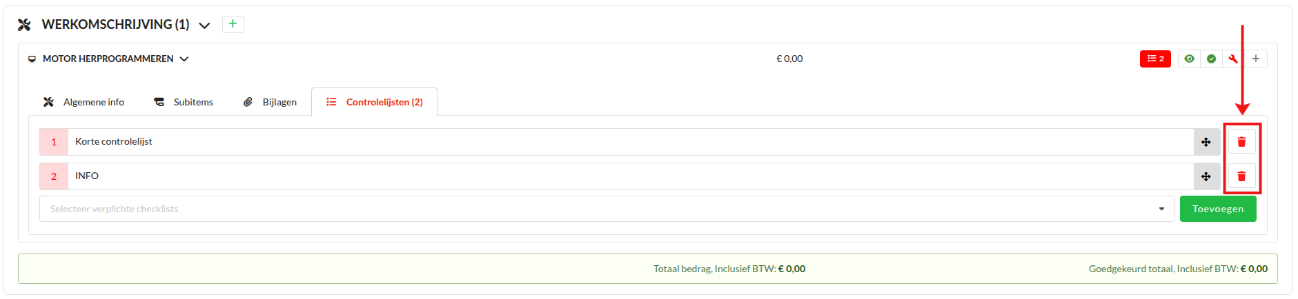Je kunt een toegewezen controlelijst verwijderen door op het rode prullenbak icoon te klikken.