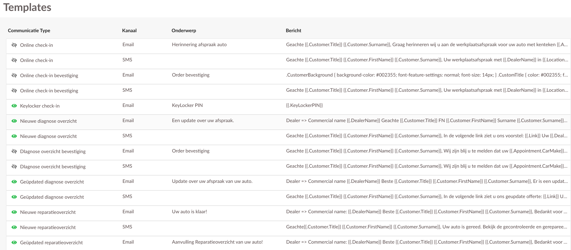 Met het oogpictogram wordt weergegeven of de template actief (groen) of niet actief (grijs) is.