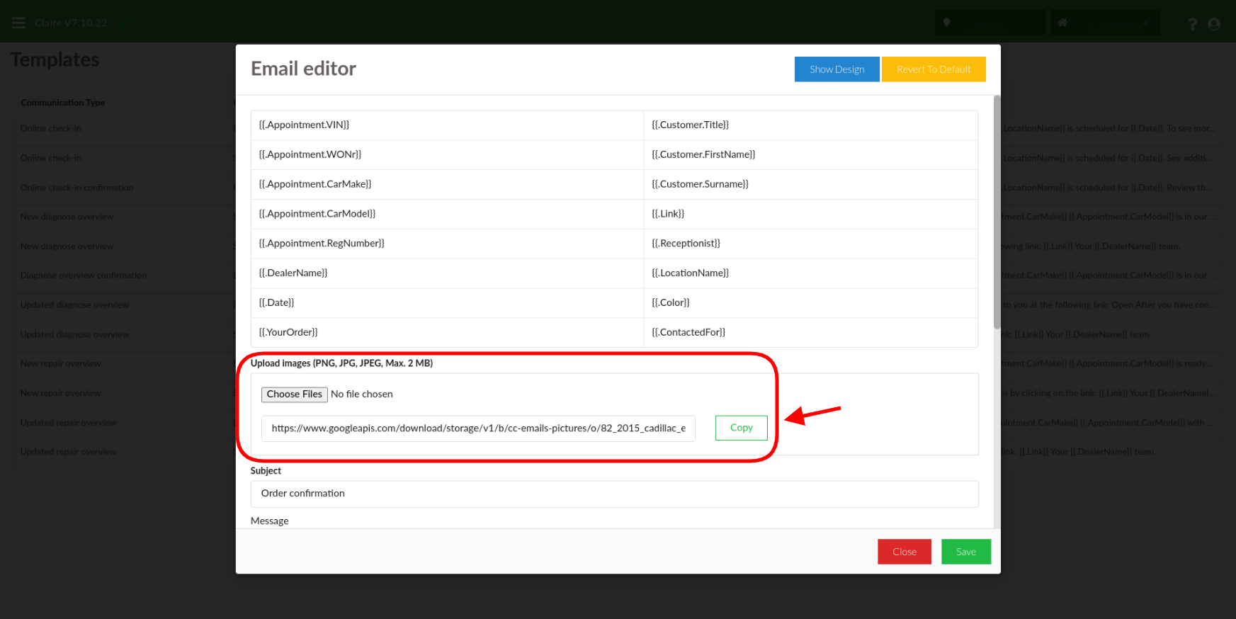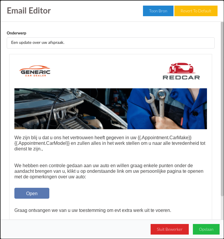 Met deze tool kan je ook headerafbeeldingen, logo's en knoppen toevoegen. Met de tekst tussen de dubbele haakjes {{ }}, kan er data uit Claire worden gehaald.