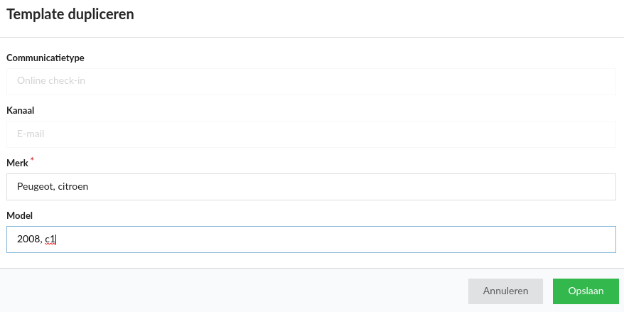 In de dupliceer template pop-up, vul hier een of meerdere merk(en) in, gescheiden door een komma.