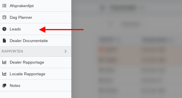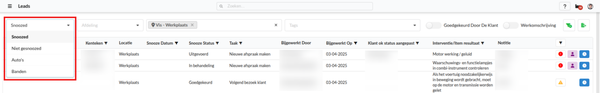 De pagina Leads opent en toont standaard de niet gerepareerde items van de afgelopen maand en de gesnoozede items van jouw standaard locatie.