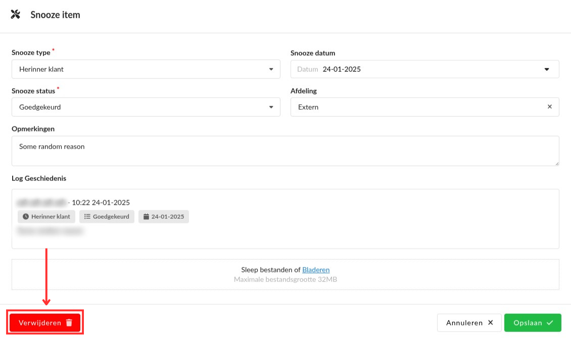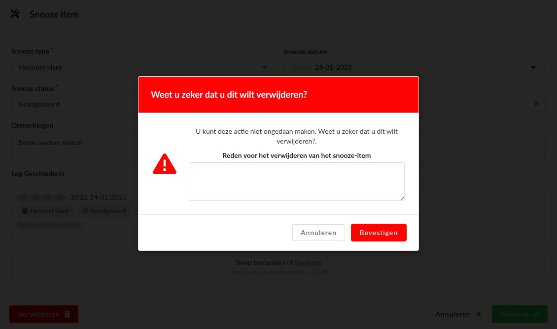 Stap 1: Open een gesnoozed item door op het blauwe klokje te klikken. Klik daarna rechtsonderin op Verwijderen.
