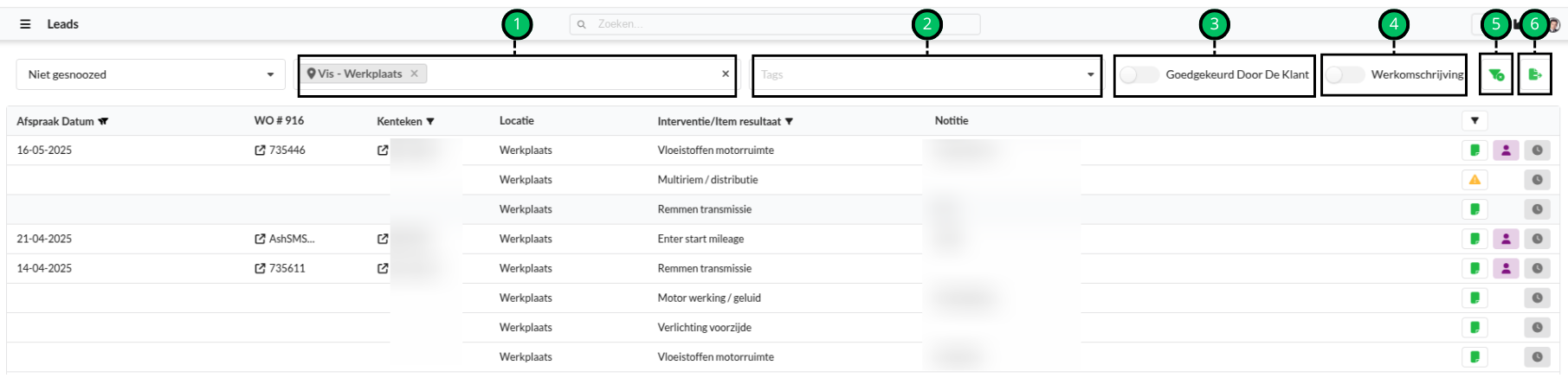 1 | Zoekbalk | Zoek hier op kenteken of werkordernummer. |